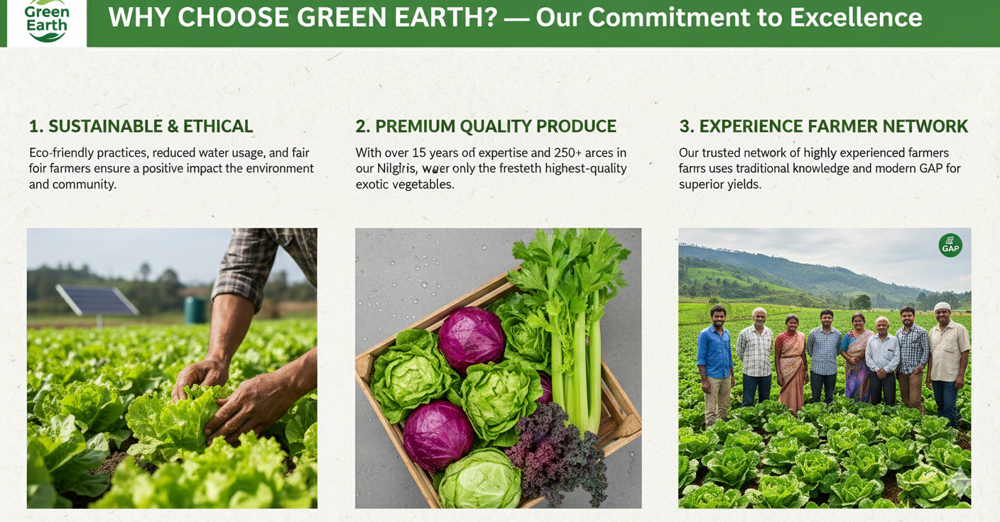 Since most of the exotic vegetables are used raw or for culinary purposes, Green Earth follows Good Agricultural Practices (GAP) such as use of approved pesticides, fertilizers and good hygiene practices so as to ensure supply of safe to eat foods. Around 80 percent of the produce is dispatched to distant cities like Mumbai, Delhi and Bangalore in a cold chain with dedicated Refer trucks. Systems developed by Greenearth has reduced post-harvest losses of the vegetables to Less than 5% aginst the country average of 30-40%.